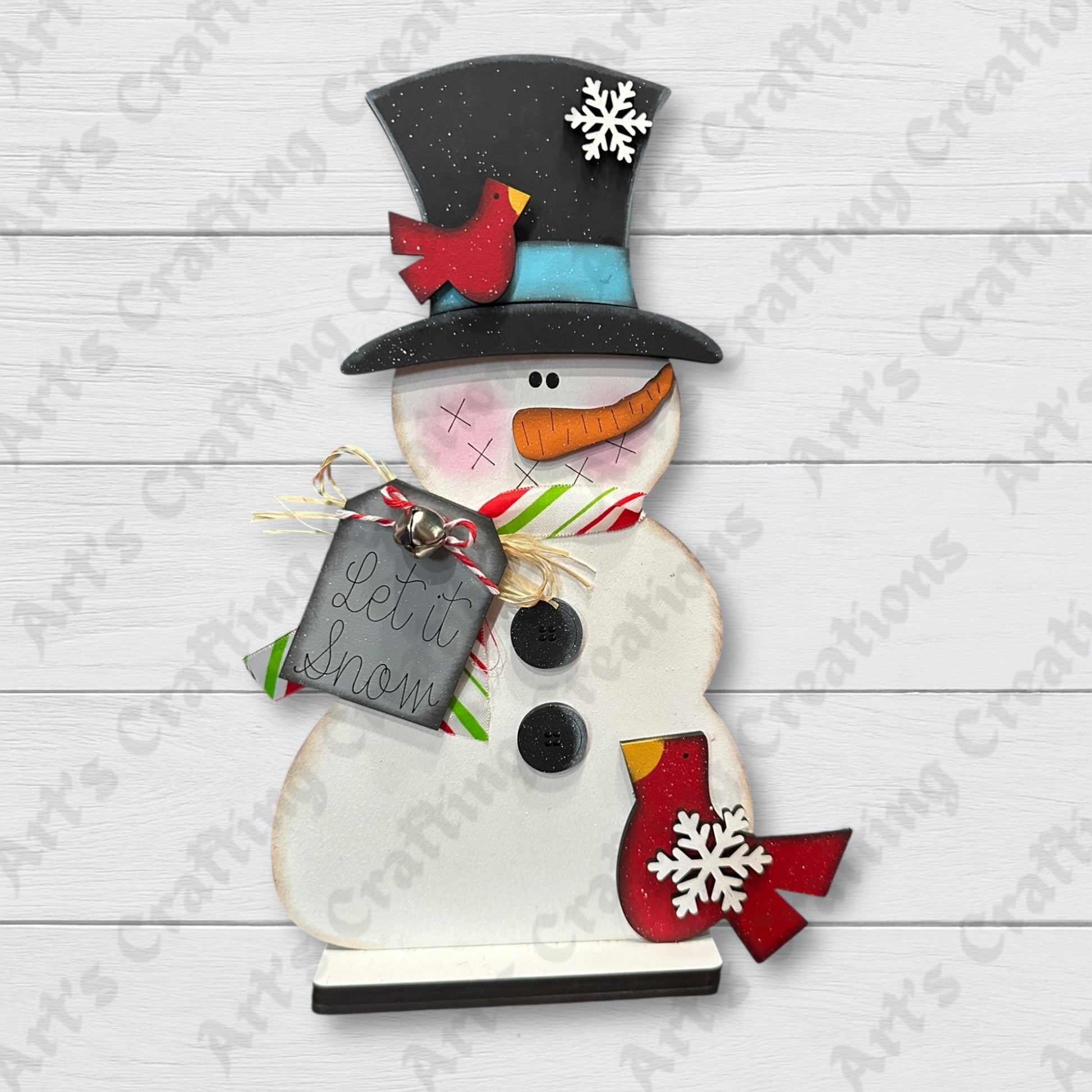 Cheer up your space with this playful Snowman with Bird Shelf Sitter. The friendly snowman sports a cozy tag tied around its neck that says "Let it snow," and two bright cardinals perch happily on it. This charming decoration brings festive fun and warmth to any shelf or mantel.