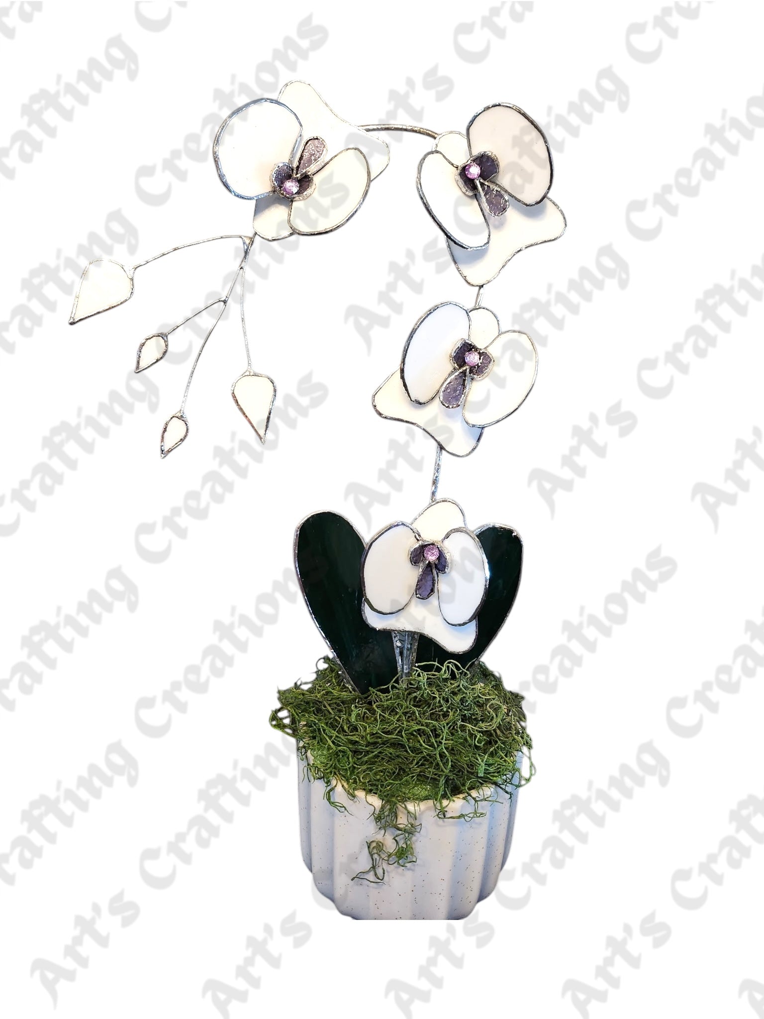 Experience the delicate beauty of nature with our Stained Glass Orchid. This mesmerizing piece features a perfectly crafted orchid made from stained glass, adorned with a bed of lush moss, all resting atop a stylish decorative pot. Bring a touch of elegance and tranquility to any space with this stunning work of art.